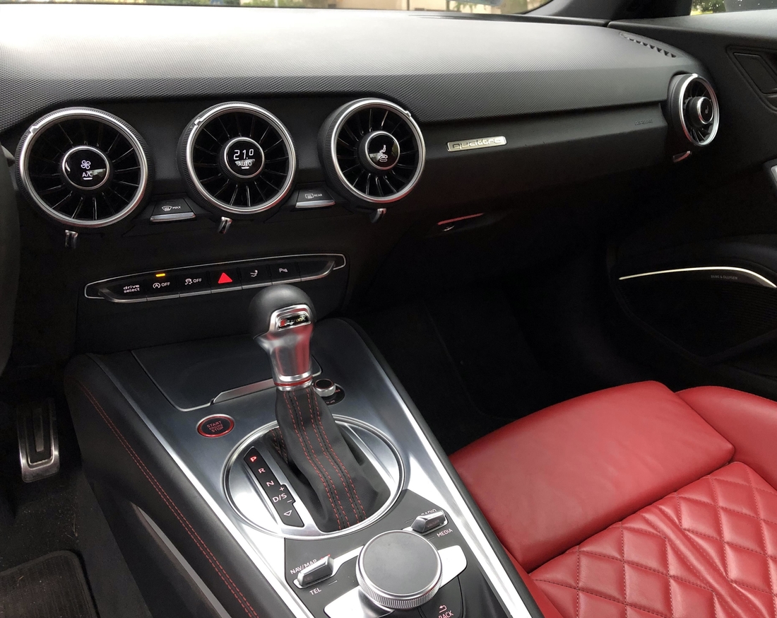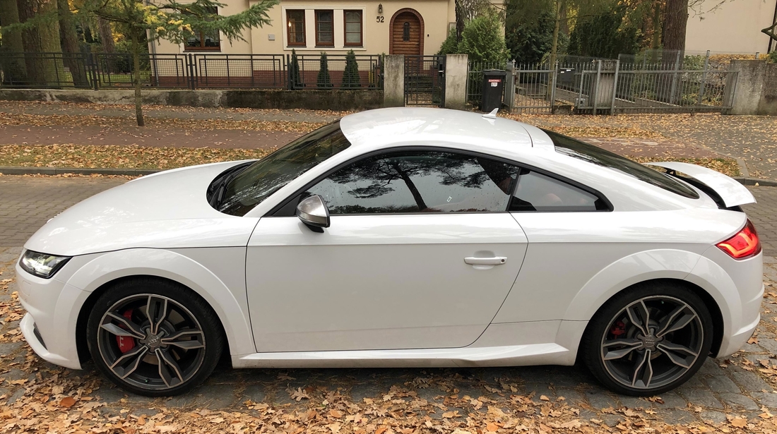 Prezentowane przeze mnie Audi TTS pochodzi z 2016 roku. III generacja tego modelu charakteryzuje się ostrymi liniami nadwozia, zrezygnowano z krągłości, które dominowały w poprzedniej wersji i tym samym nowe Audi otrzymało zdecydowanie więcej sportowego DNA. Poza charakterystyczną, łagodnie opadającą linią dachu i kształtem bocznych szyb nie znajdziemy żadnego innego podobieństwa do poprzedniej generacji tego zadziornego wozidła.., i bardzo dobrze. Auto cały czas przypomina mi elektroniczną kapsułę wyposażoną w silnik, cztery koła i kierownicę, która służy do bardzo szybkiego przemieszczania się w czasie i przestrzeni. Moją szczególną uwagę zwróciły ogromne nadkola zachodzące na krawędź maski, reflektory przypominające swoim kształtem oczy robota, wielki grill i cztery końcówki układu wydechowego. Cała bryła tego auta to jedna wielka fantastyka, która w mojej skali lansu i kozactwa zajmuje wysokie miejsce z notą 9.1/10 punktów. Otwieram bezramkowe drzwiczki (bo wielkie drzwi to raczej nie są) i moim oczom ukazuje się centrum sterowania małym statkiem międzygalaktycznym. Sportowe fotele obszyte czerwoną skórą, listwa progowa z napisem TTS wykonana z polerowanego aluminium, tradycyjnie już duży, wielofunkcyjny monitor centralny i okrągłe kratki nawiewu powietrza wyposażone w mini wyświetlacze i przyciski. Całość świetnie spasowana i jak to w Audi ergonomicznie rozmieszczona. Obracam głowę i widzę dwa fotele za moimi plecami, które swoim wyglądem budzą moją wyobraźnię i przywodzą na myśl wagon kolejowy pociągu TLK Oscypek relacji Warszawa- Zakopane, w którym to możemy znaleźć w przedsionku składane siedzonka dla tych dla których zabrakło miejsca w przedziale, ale mnie one nie dotyczą, przynajmniej w tej chwili. Próba zajęcia miejsca w fotelu kierowcy faktycznie przypomina wejście do kapsuły. W pierwszym momencie czułem się trochę przytłoczony, ale zaraz to uczucie mija za sprawą wygodnej pozycji za sportową, wielofunkcyjną kierownicą. Wszystko pod ręką, widoczność na boki świetna, jedynie tylko przednia szyba wydaje się dosyć mała i ograniczająca widoczność, ale podczas jazdy szybko o tym zapominamy przyzwyczajając się do warunków w jakich przyszło nam dowodzić tą jednostką. Sterowanie funkcjami samochodu to współczesna, niemiecka klasyka gatunku, którą powtarzam jak mantrę podczas opisywania praktycznie każdego wozu ich produkcji, a więc; wszystkie informacje wyświetlane są na monitorze centralnym, funkcjami sterujemy za pomocą touchpada na konsoli środkowej lub przyciskami, które znajdują się po obu stronach kierownicy. Za sprawą systemu Audi MMI (Multimedia Interface) sterowanie jest intuicyjne i nie przysparza większych problemów. Grzebiąc w menu znalazłem ciekawą funkcję, której nie widziałem zbyt często w innych samochodach. Konfigurując tryb jazdy Individual możemy ustawić dużo więcej parametrów auta niż gdziekolwiek indziej. Wchodząc w menu mamy wpływ na głośność układu wydechowego, działanie napędu Quattro, pracę silnika i skrzyni biegów, pracę układu kierowniczego i zawieszenia, wszystko możemy ustawić niezależnie od siebie. Jeśli natomiast mamy lenia i zwyczajnie nie chcemy się zagłębiać w temat to włączamy tryb AUTO, a komputer będzie dostosowywał wszystkie wyżej wymienione nastawy pojazdu zgodnie z rozkazem naszej prawej nogi. Informacji wyświetlanych na tym jedynym monitorze jest ogrom, począwszy od prędkościomierza i obrotomierza, (których wygląd możemy zmienić) po asystenta zmiany pasa ruchu, od wskaźnika doładowania (Boost) po radio i telefon, od całego menu ustawień pojazdu po temperaturę zewnętrzną oraz temperaturę oleju, a także temperaturę wody w chłodnicy itd., itd.., i jeszcze itd.